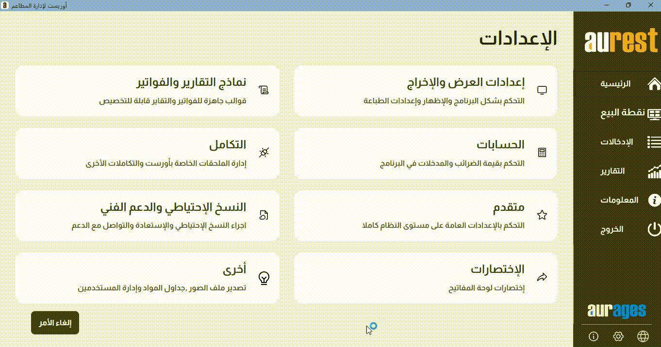 يُوفّر نظام أورست إعدادات متقدمة لإدارة الإخراج والطباعة داخل أقسام المنشأة المختلفة، بما يشمل فواتير العملاء، طلبات الكابتن، وأوامر المطبخ. تهدف هذه الإعدادات إلى تخصيص تجربة الطباعة بحسب طبيعة العمل، مع ضمان الدقة والوضوح وسرعة التنفيذ في جميع مراحل الخدمة.