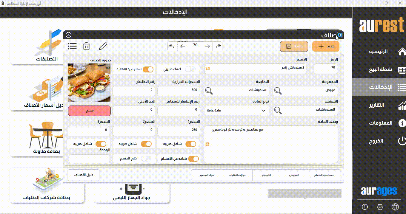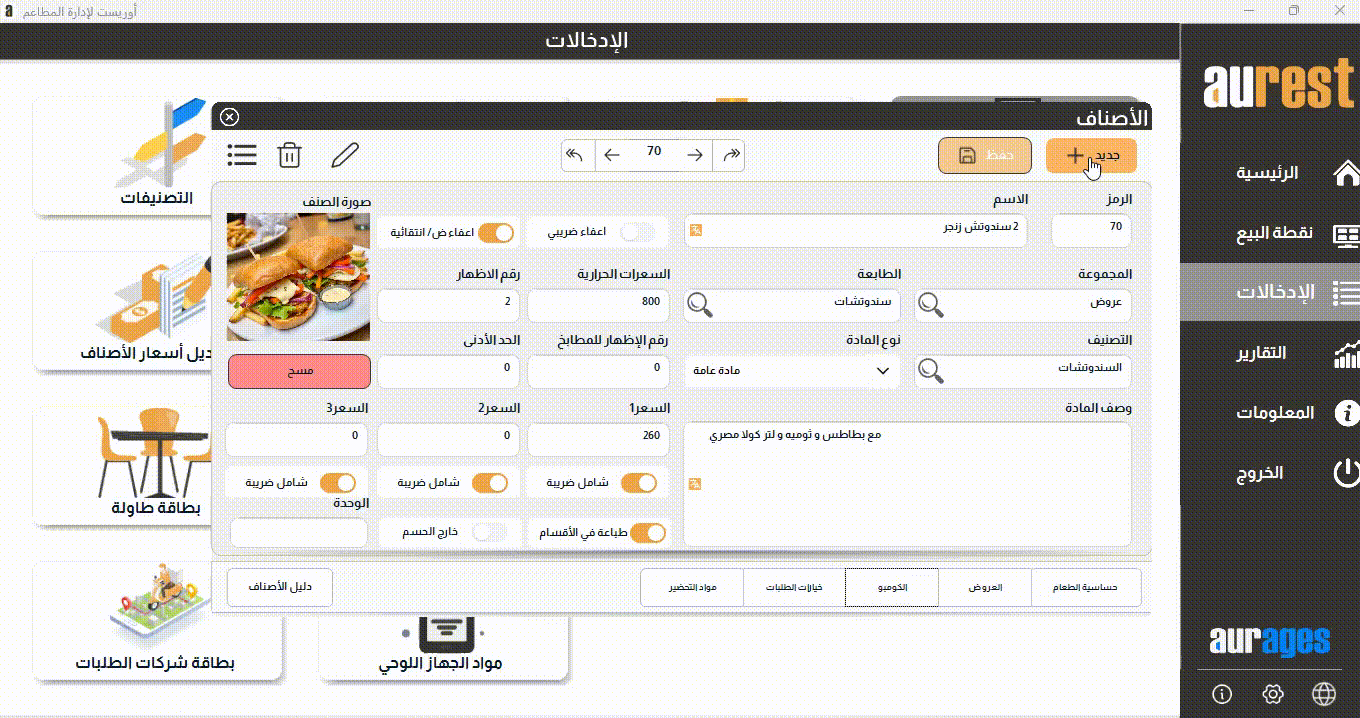 يوفّر نظام أورست مجموعة من الأدوات الإضافية المتقدمة ضمن شاشة إدخال الأصناف، مما يتيح مرونة عالية في تخصيص كل صنف بما يناسب احتياجات التشغيل اليومية. تشمل هذه الأدوات: مكونات التحضير، خيارات الطلبات، الكومبو، العروض، حساسية الطعام، ودليل الأصناف.