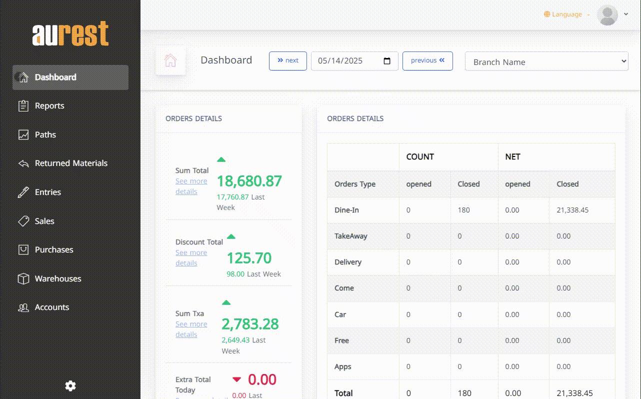 Order Breakdown by Type: Displays types of orders (dine-in, takeaway, delivery, etc.) with automatic calculation of taxes, additional fees, and returns.