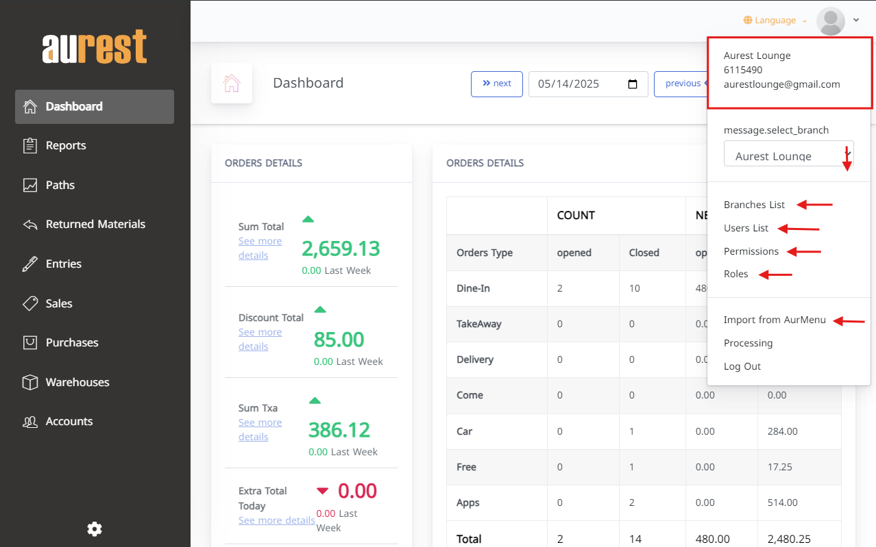 Import from Aurmenu: Import your full menu, including categories, images, and prices, directly from the Aurmenu platform.